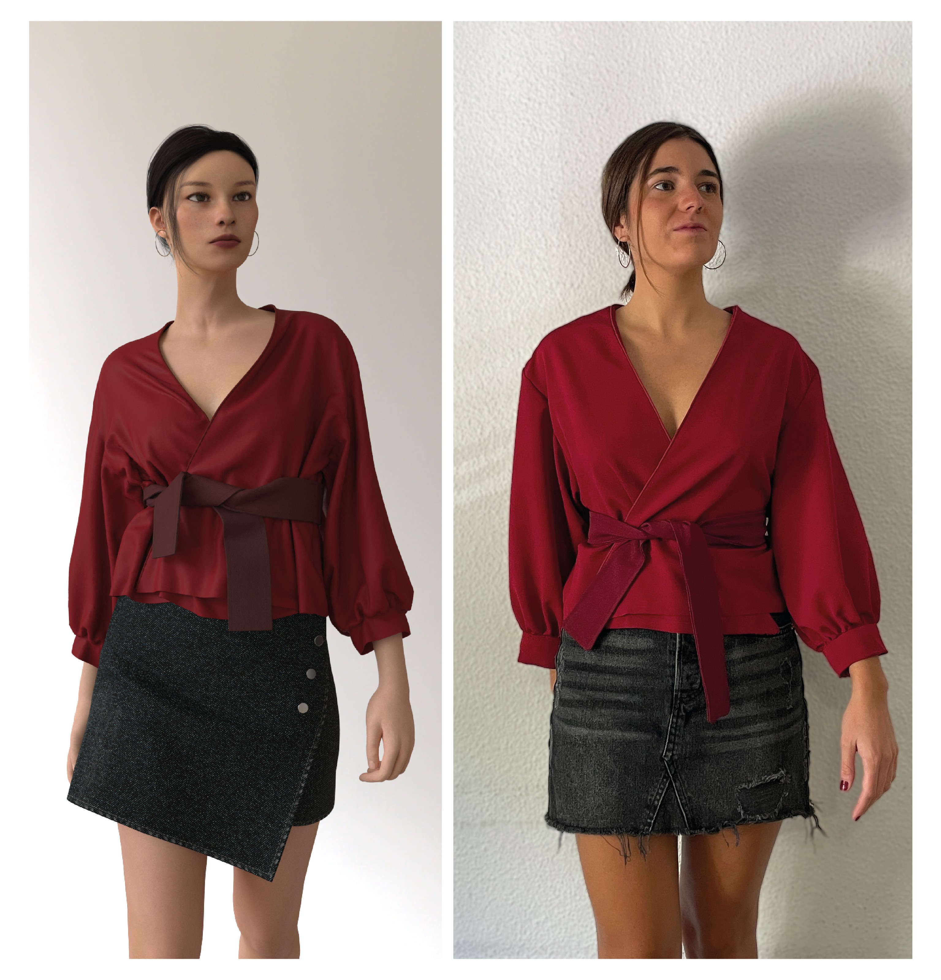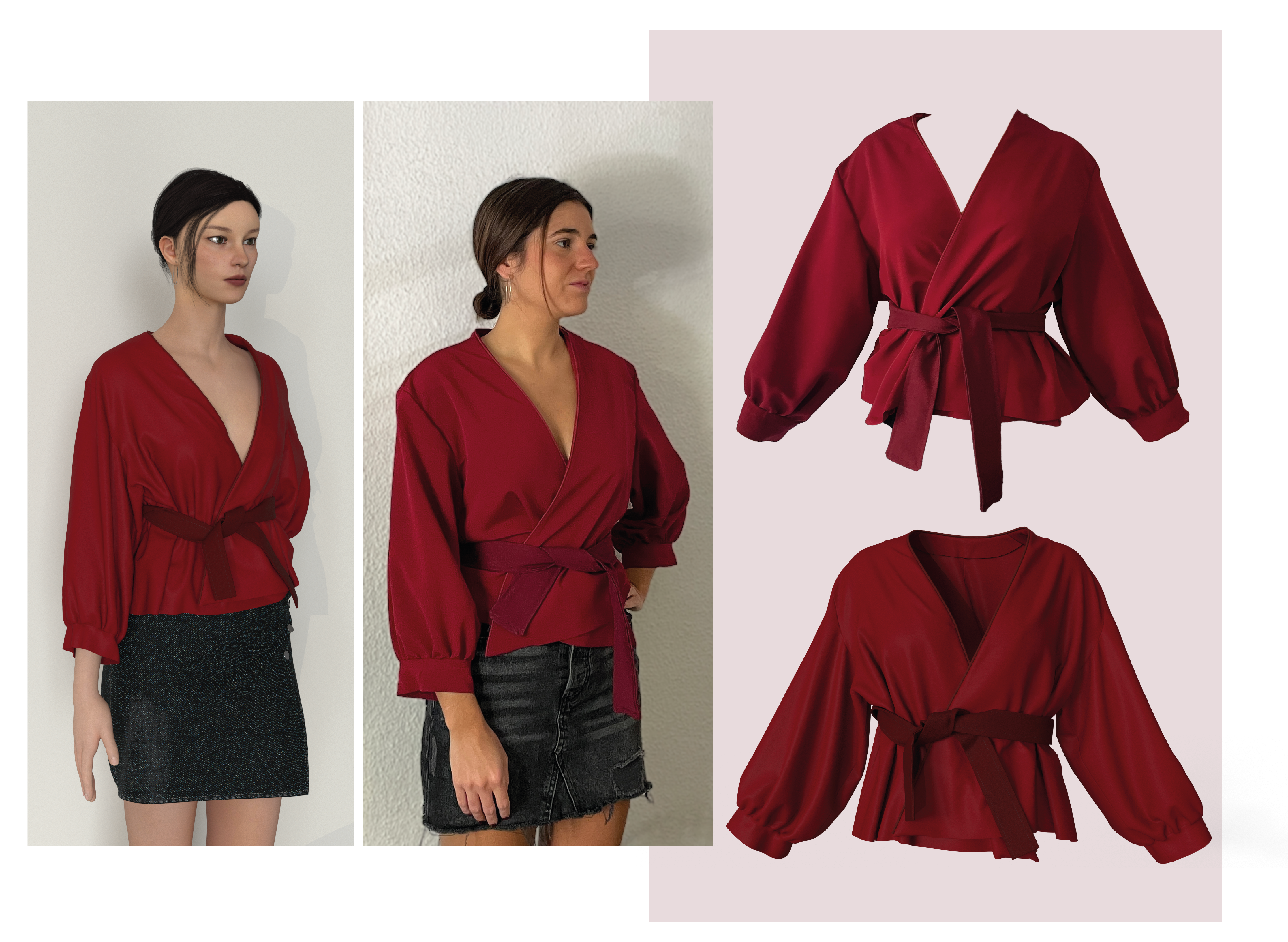 Working on the red blouse posed several challenges translating the design from digital to physical. During the digital simulation, issues such as sleeve adjustments and the crossover of the wrap were identified, streamlining the process and saving time. Additionally, finishing details like piping and hems, which are simple digitally, demanded significant attention in physical production. Sewing the puffed sleeves was particularly challenging, requiring precision to maintain the intended volume and shape. This project emphasized the benefits of digital tools and the craftsmanship essential for creating physical garments.