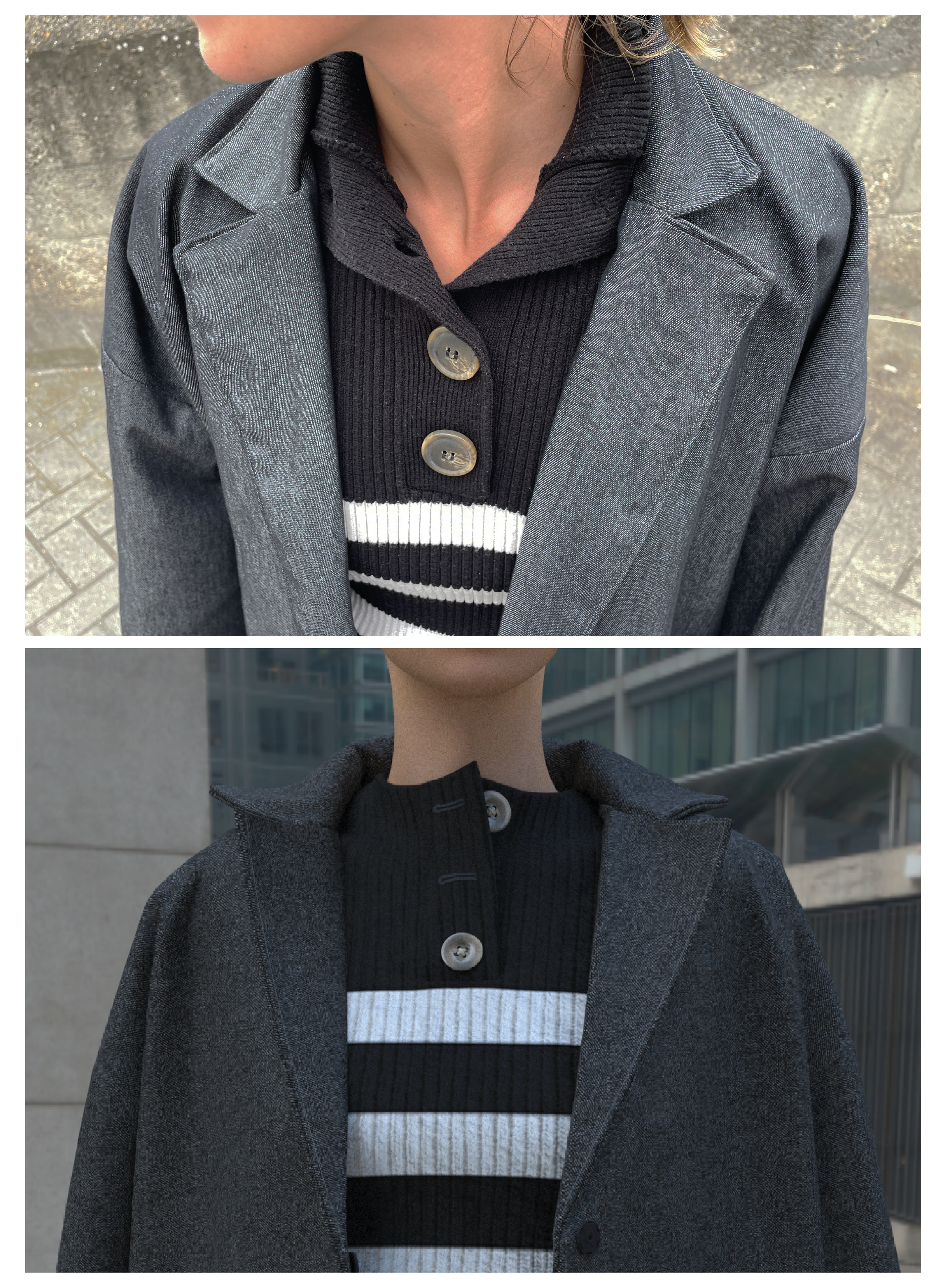 The oversized denim coat presented challenges in achieving clean finishes and structured lapels. While the digital prototype captured the design, the physical version revealed differences in fabric behavior, depending on denim weight. The oversized fit made adjustments easier, reducing concerns about precise measurements. This comparison showed the value of digital prototyping for early detail detection, but emphasized the need for physical testing, especially for finishes like hems and lapels.